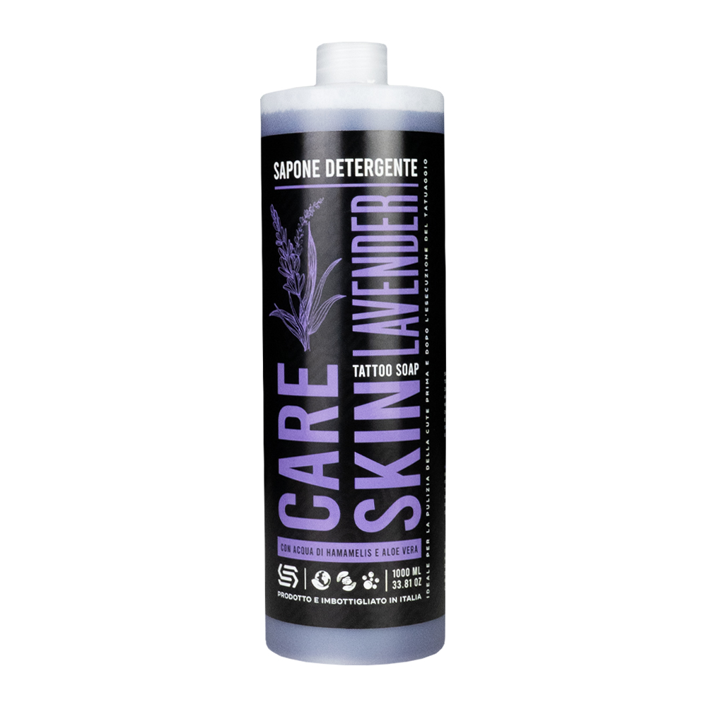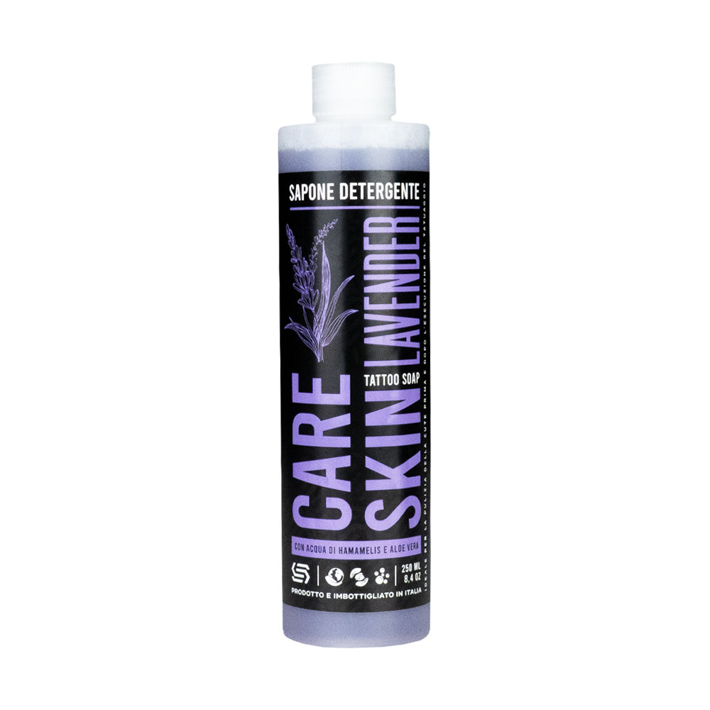 Antibakterielle und hypoallergene Reinigungsseife mit Limetten-Lavendel, ideal zur Reinigung der Haut vor und nach dem Tätowieren.